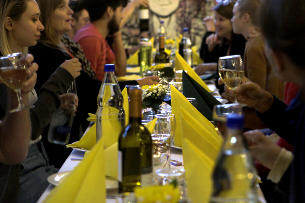 Eine lange Tafel unter freiem Himmel, prall gefüllte Teller und angeregte Gespräche mit bekannten und unbekannten Sitznachbar:innen: Das ist das Festival Dinner!