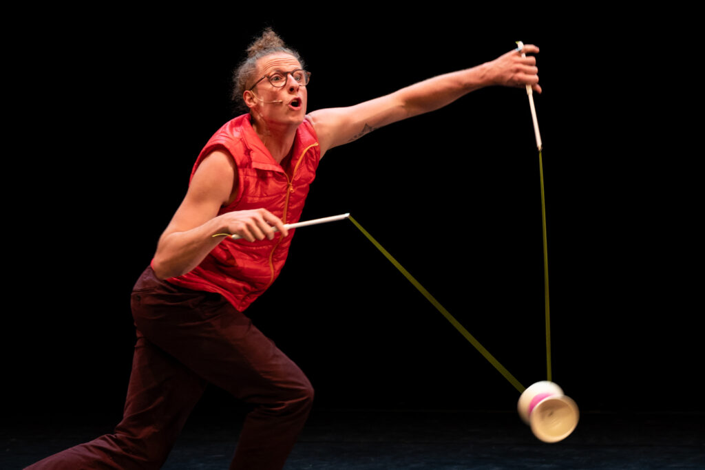 Zwei Artist:innen, eine sehr kleine Bühne und ein ständig wachsender Haufen von aufblasbaren Gegenständen. In diesem poetischen und absurden Duett schrumpft der Raum, während das Chaos wächst – Diabolos fliegen und Körper verheddern sich in einem bizarren Tanz der Anpassung. Mit Akrobatik und einer guten Portion Selbstironie navigieren zwei Figuren durch die Komplexität des gemeinsamen Raums. Diese speziell für Mikro-Veranstaltungsorte wie das Wagenvarieté entwickelte Show verwandelt vier Quadratmeter in einen Spielplatz der Erfindungsgabe, Absurdität und Verbundenheit.